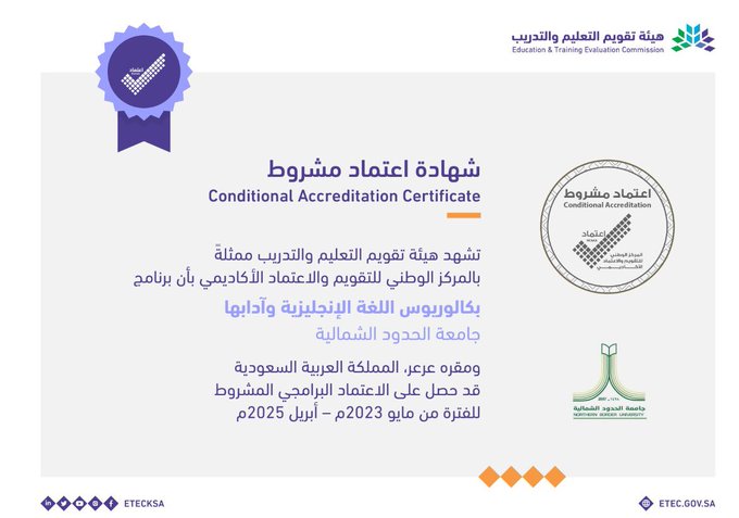 21 شوّال 1444 حصل برنامج اللغة الإنجليزية وآدابها بجامعة الحدود الشمالية على الاعتماد الاكاديمي 26 رَجب 1443 افتتاح نادي اللغة الإنجليزية بشطري الطلاب و الطالبات
